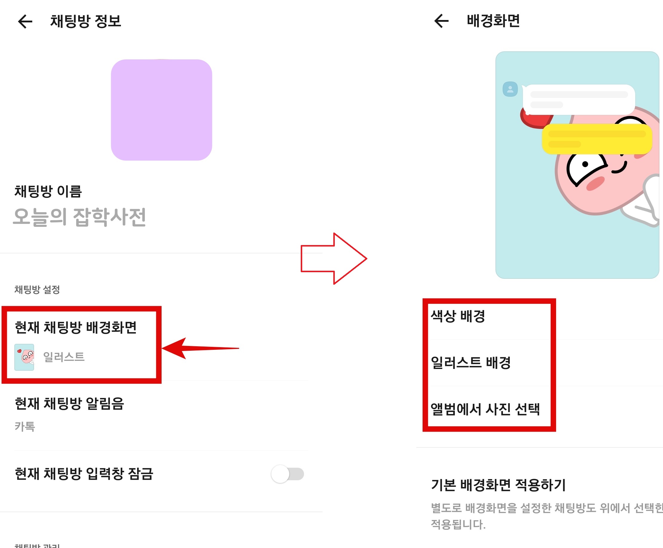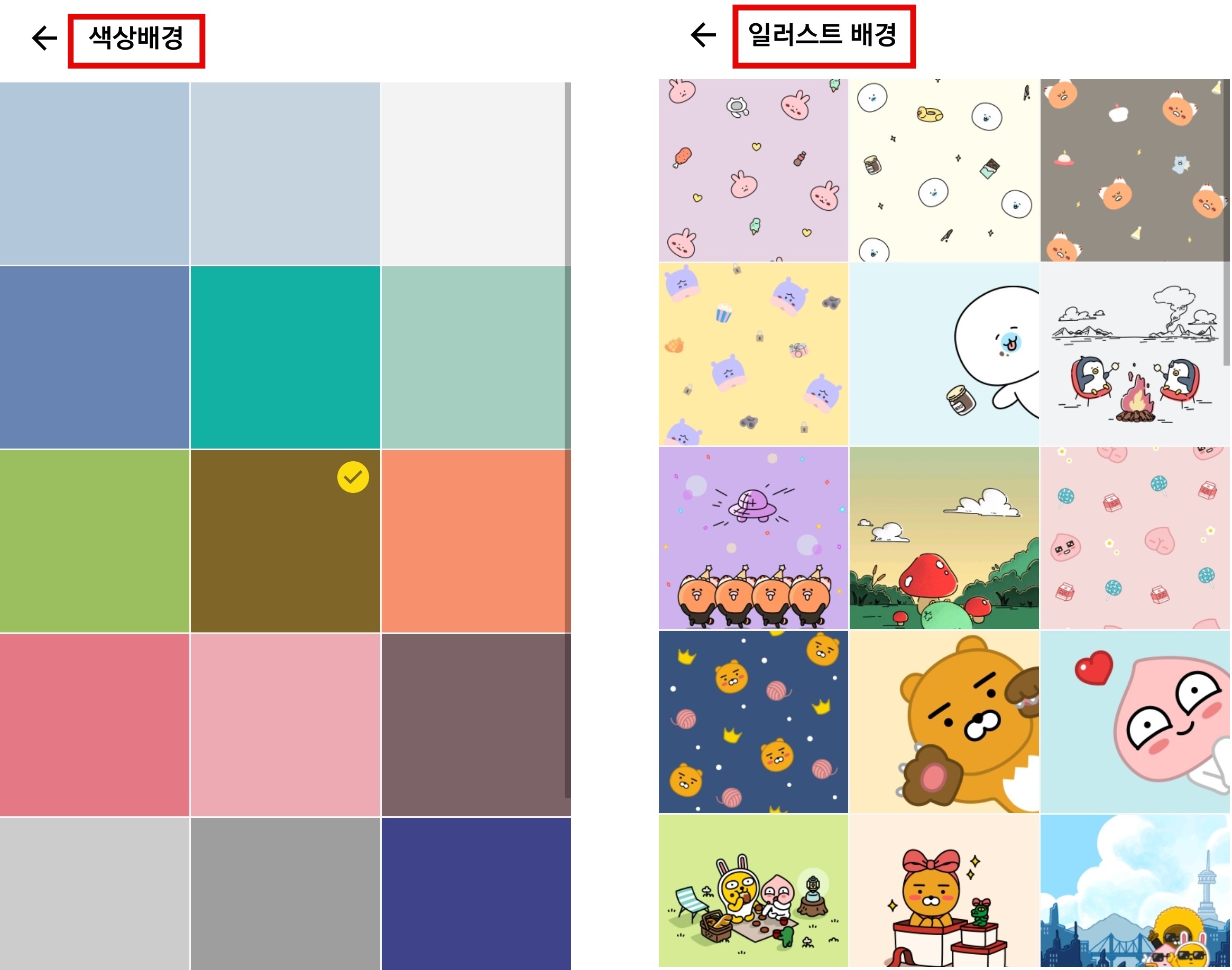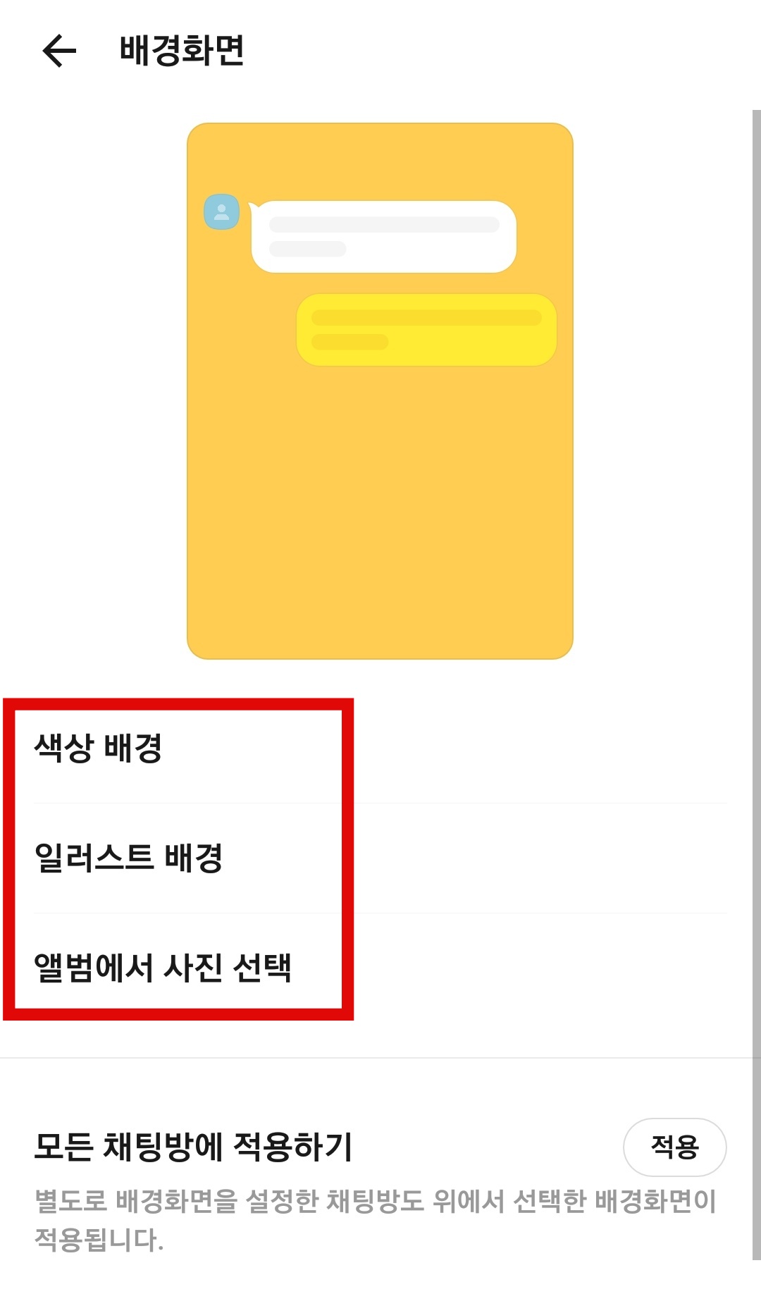 이곳에서 채팅방에 적용할 배경을 지정할 수 있는데, 색상 및 일러스트, 앨범사진에서 선택하여 자유롭게 적용이 가능합니다.