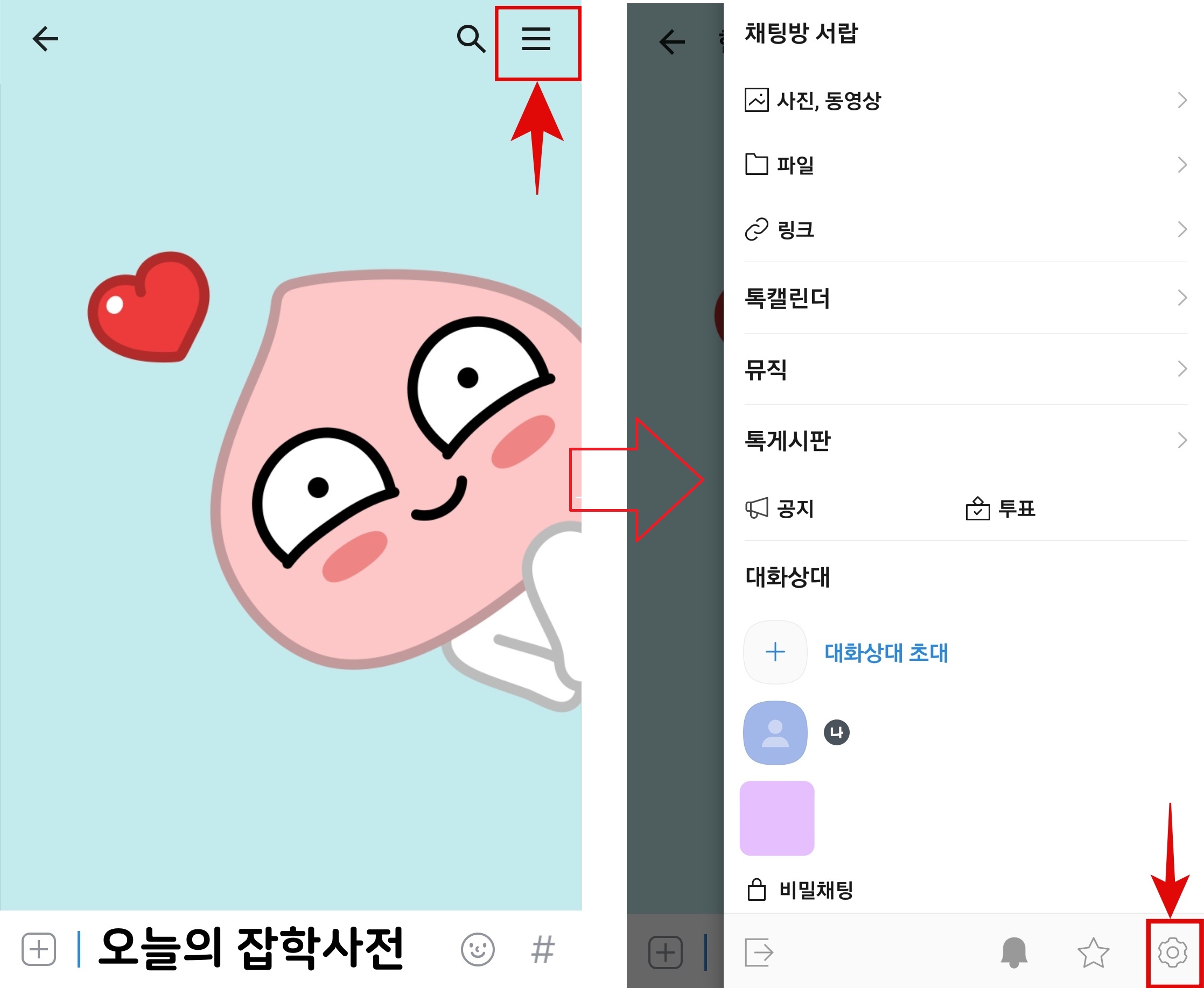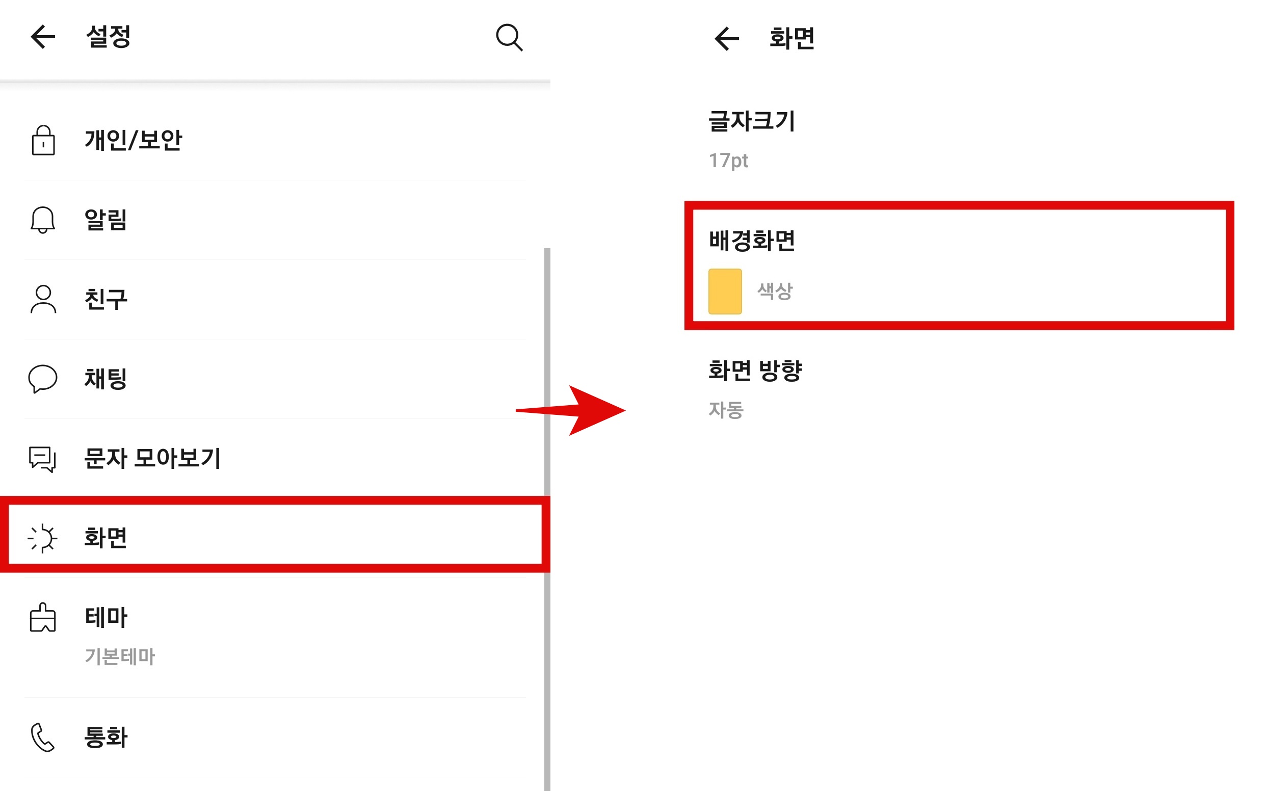 채팅방은 전체적으로 한번에 적용해 줄 수도 있고, 개별 방마다 다른 배경을 설정할 수도 있습니다. 먼저 전체적으로 적용하는 방법에 대해 알아보도록 하겠습니다.