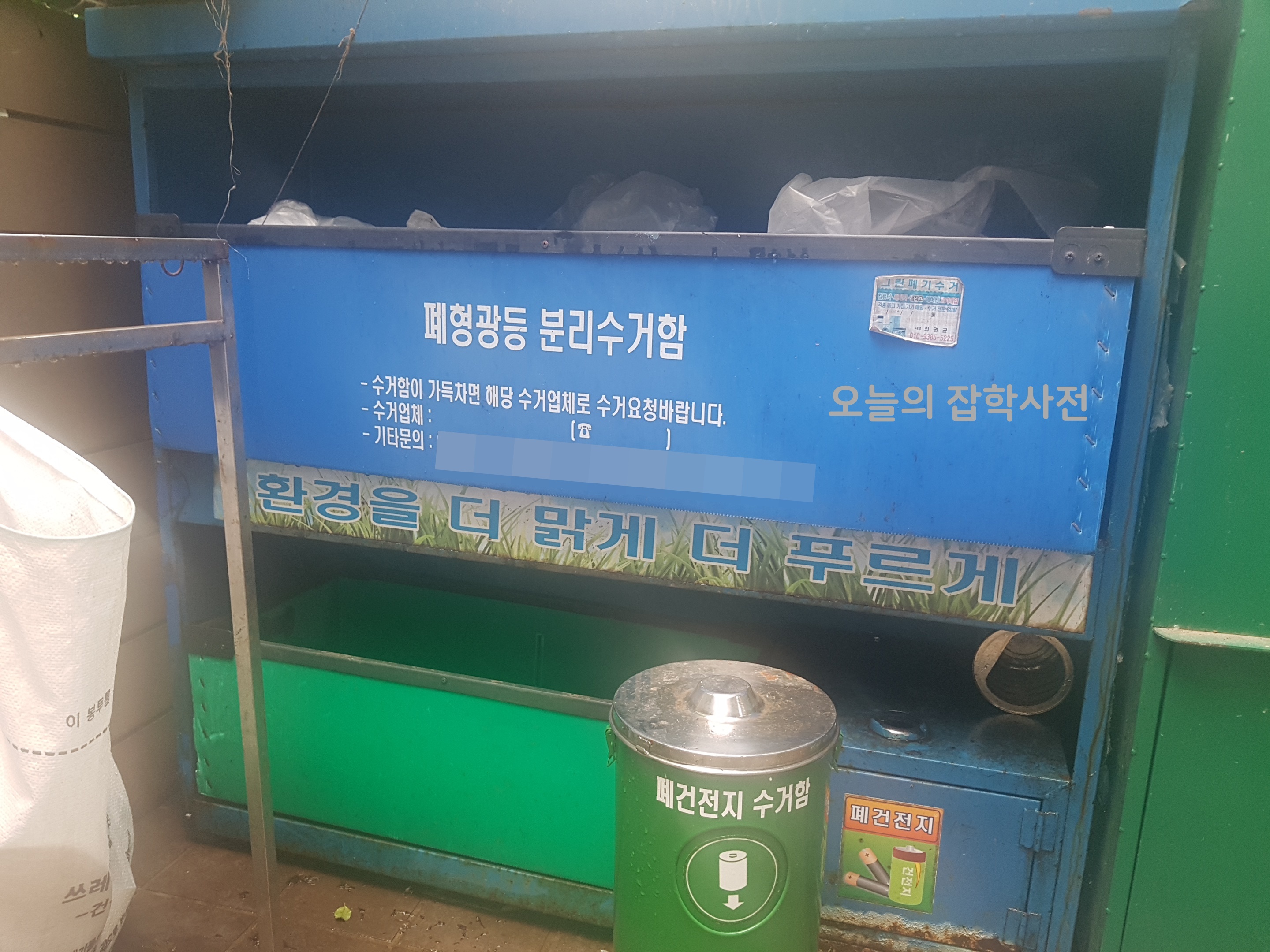 우리나라의 경우 폐형광등을 안전하게 수거하기 위해 생산자 책임 재활용제도(제품의 생산&포장자에게 주어지는 폐기물의 재활용 의무)가 시행되고 있습니다. 때문에 형광등만 따로 수거하기 위한 수거함이 마련되어 있습니다.