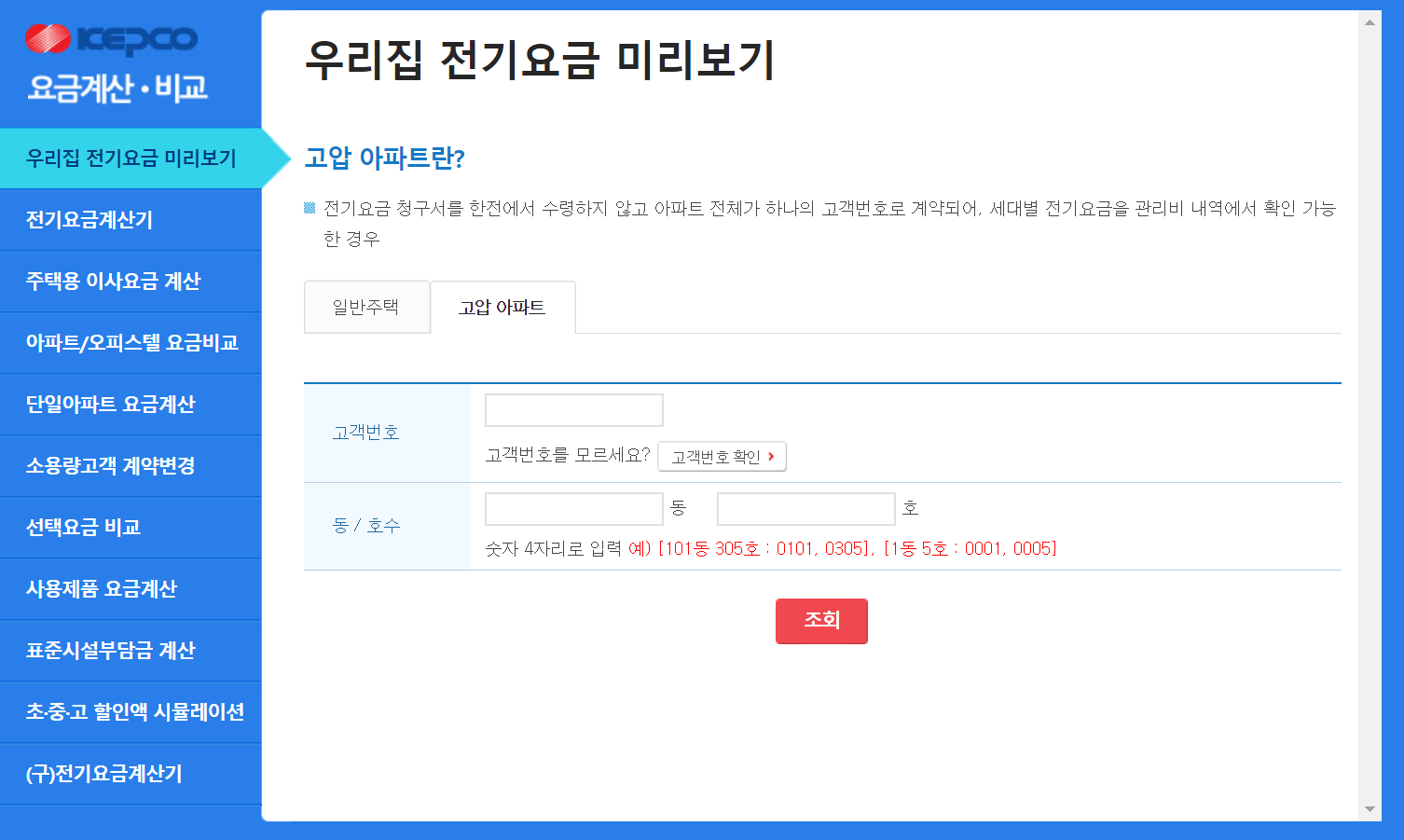 간단하게 예상요금을 확인해 보고자 할떄는 좌측 가장 상단에 있는 우리집 전기요금 미리보기 탭을 누른 뒤, 주택 혹은 아파트를 선택해 줍니다. 만약 전기비 고지서가 한국전력에서 직접 오지 않고 아파트 관리비 내역서에 포함되어 나오는 경우라면 (고압 아파트)를 선택해 주시면 됩니다. 여기서 (고객번호)는 관리비 내역서 앞부분에 작게 나와있으니 확인하시어 입력해 주시고, 사시는 곳의 동/호수를 입력후 (조회) 하시면 됩니다. 그밖에도 전기요금 계산과 관련된 여러가지 서비스를 제공하고 있으니 한번 살펴보시면 도움이 됩니다.