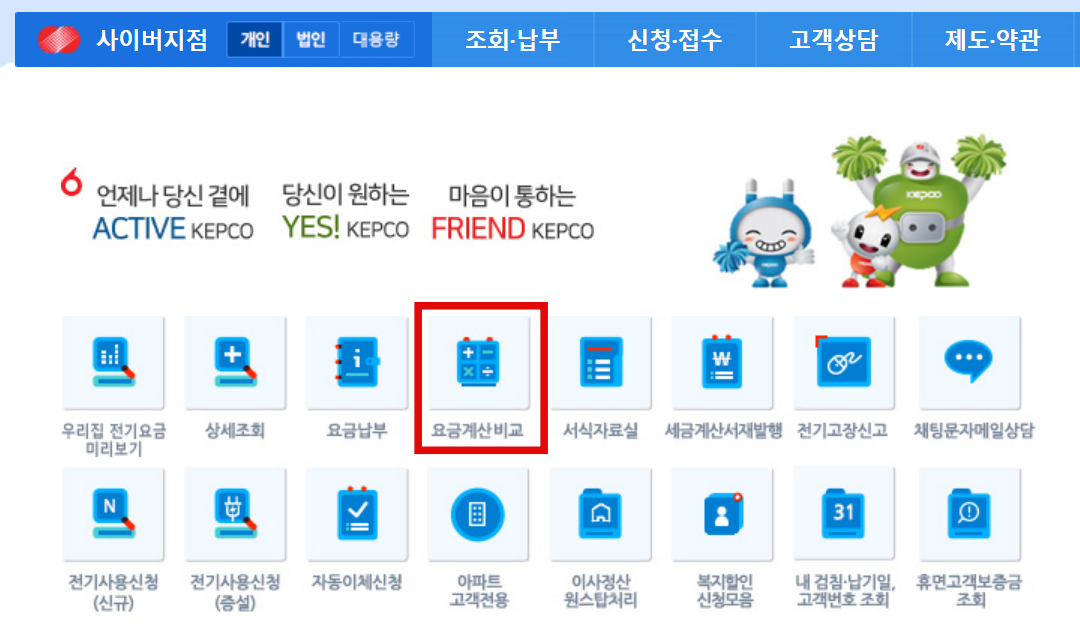 한국전력 사이버 지점 사이트를 통해 현재 검침량을 입력하고 예상 요금 등을 확인해 볼 수 있습니다.