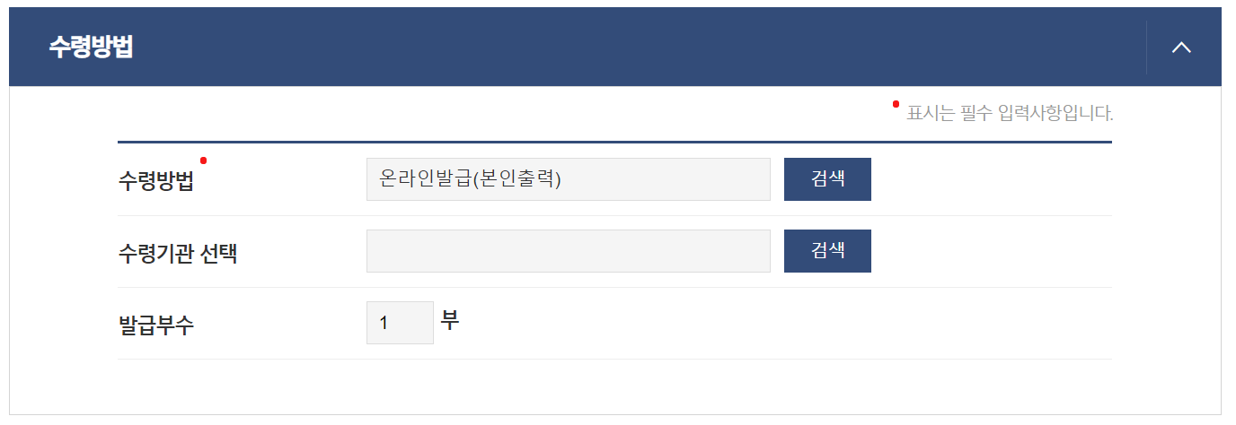 수령방법은 프린터기가 있으면 가정에서 직접 출력이 가능하며, 발급기관을 따로 선택 할 수도 있습니다. 온라인으로 발급시 발급기관 선택은 하지 않아도 됩니다. 필요한 부수를 체크 후 넘어갑니다.