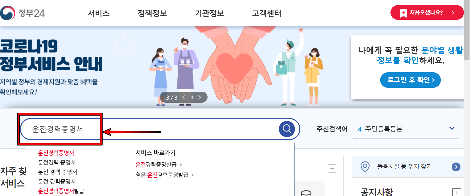 메인화면을 보시면 검색창이 보입니다. 평소 민원사항이 있으면 이곳에 입력하면 관련 서비스가 모두 나오니 활용해보시기 바랍니다. 여기서는 취득일 조회를 위해 '운전경력증명서'를 입력해 줍니다.