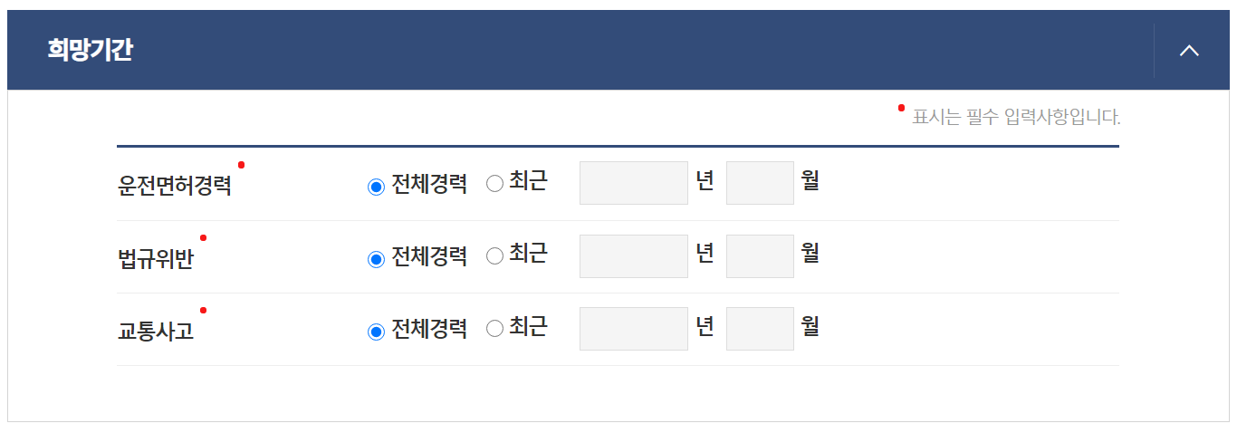 희망기간은 (전체경력)으로 기본적으로 선택되어 있습니다. 최근 ~년,월을 기준으로 보고싶으시다면 따로 설정해 주시면 됩니다.