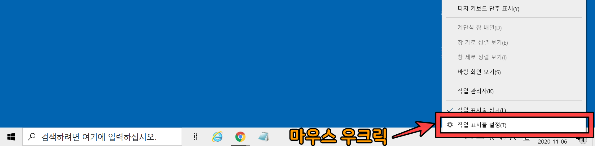 이때에는 작업표시줄 빈 공간을 마우스 오른쪽 클릭 해준 뒤, (작업표시줄 설정)을 눌러줍니다.
