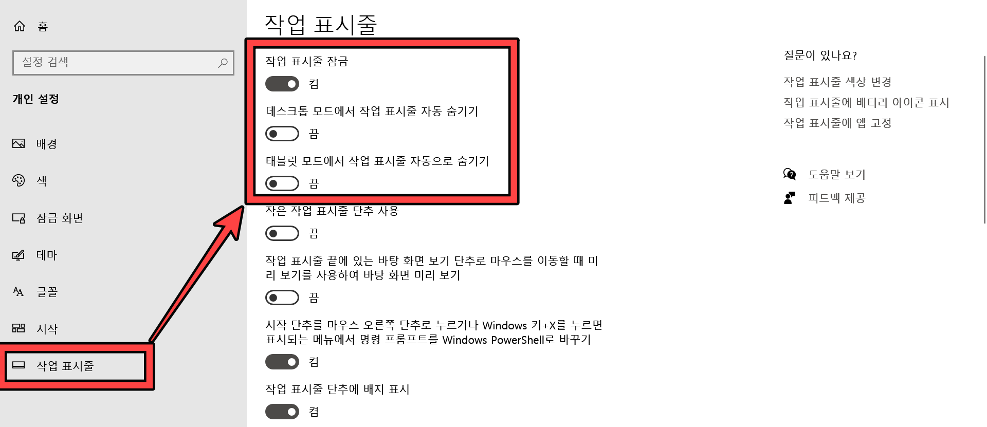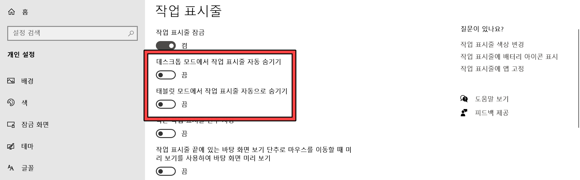 만약 작업표시줄 쪽에 마우스를 가져가면 나오고, 다시 떼면 사라지는 현상 때문에 불편하신 경우라면, (자동숨김 설정)이 되어있을 가능성이 큽니다.