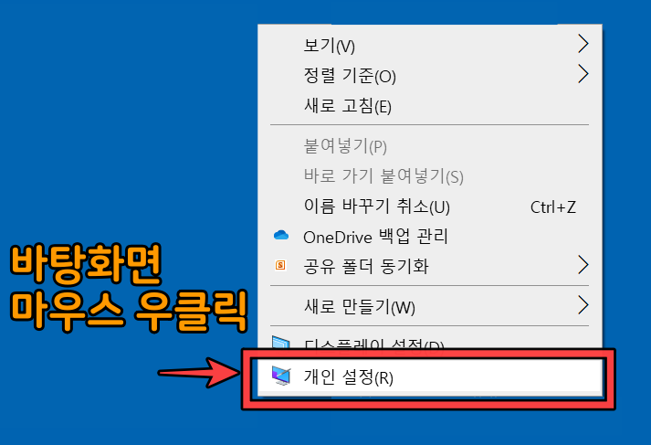 이럴땐 바탕화면을 마우스 오른쪽 클릭, (개인설정)을 눌러줍니다.