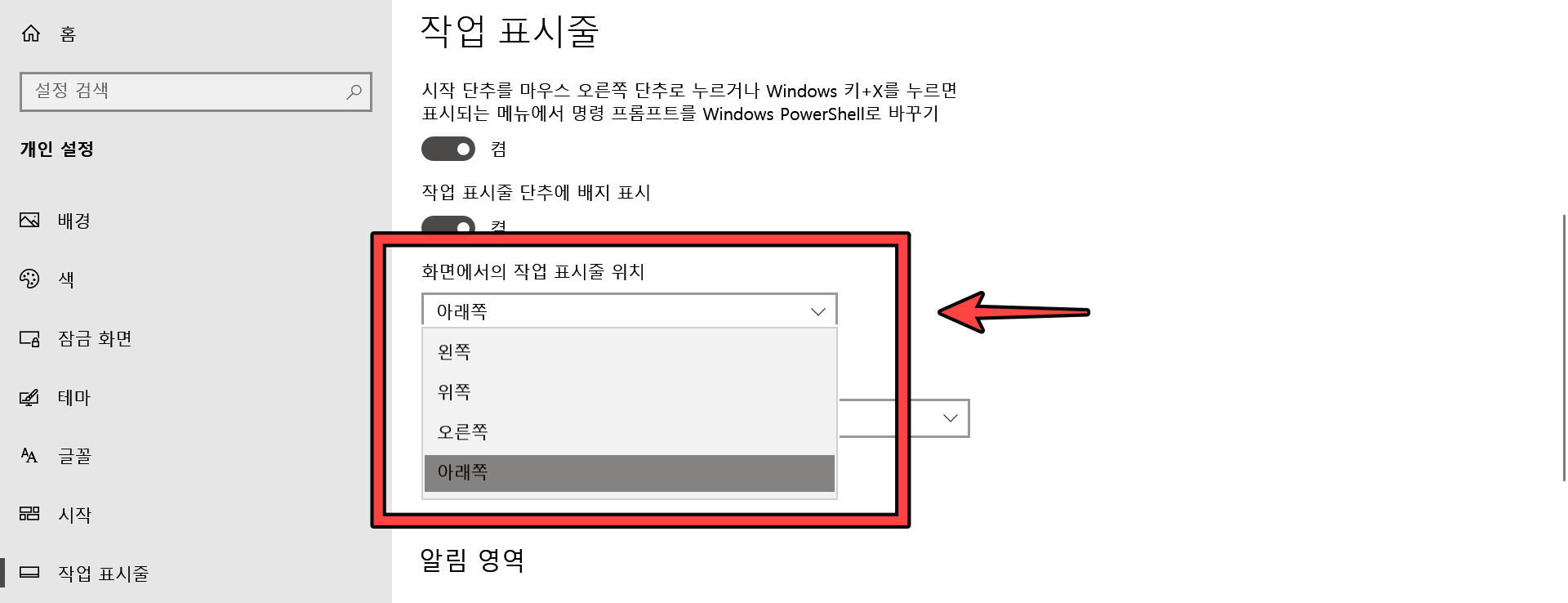 앞서 살펴봤던 작업표시줄 설정 창에서 조금 내려오시면 위치를 지정해 줄 수 있는 기능이 있습니다. 필요에 따라 위, 오른쪽 왼쪽으로 지정해 보시고 편한 설정으로 적용해서 사용하시기 바랍니다.