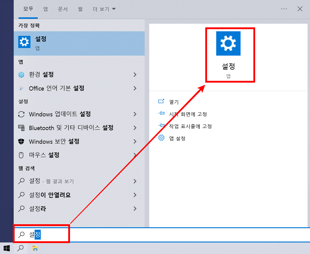 윈도우에서 작업표시줄- 돋보기 버튼을 눌러 검색창에 설정 이라고 검색합니다. 상단으로 나오는 아이콘으로 들어갑니다.