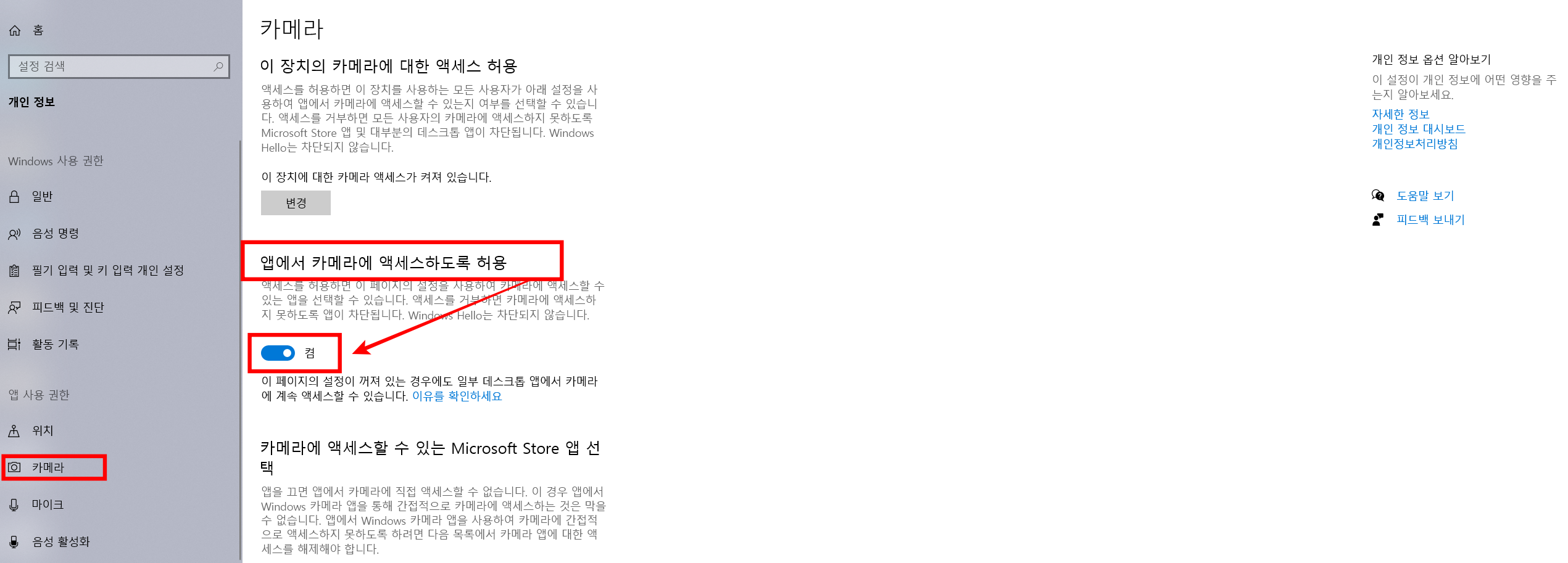 좌측에 여러가지 메뉴가 보이는데 여기서 "카메라"를 찾아주시고, 설정 부분에서 (앱에서 카메라에 액세스 하도록 허용) 부분에서 버튼을 파란색으로 바뀌도록 (켬) 상태로 바꾸어 줍니다. 보통은 이부분이 꺼져있는 상태가 되어있는 사례가 많기 때문에 보통 이 부분을 수정해주면 해결이 되시리라 생각합니다.
