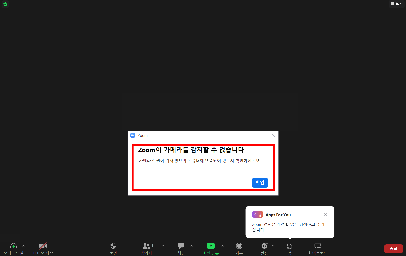 이제 문제의 (zoom이 카메라를 감지할 수 없습니다) 오류 입니다. 분명 카메라가 연결되어 있는 상태인데 이런 오류가 뜨면 굉장히 당황스러운데요, 몇가지 점검할 사항을 살펴보도록 하겠습니다.