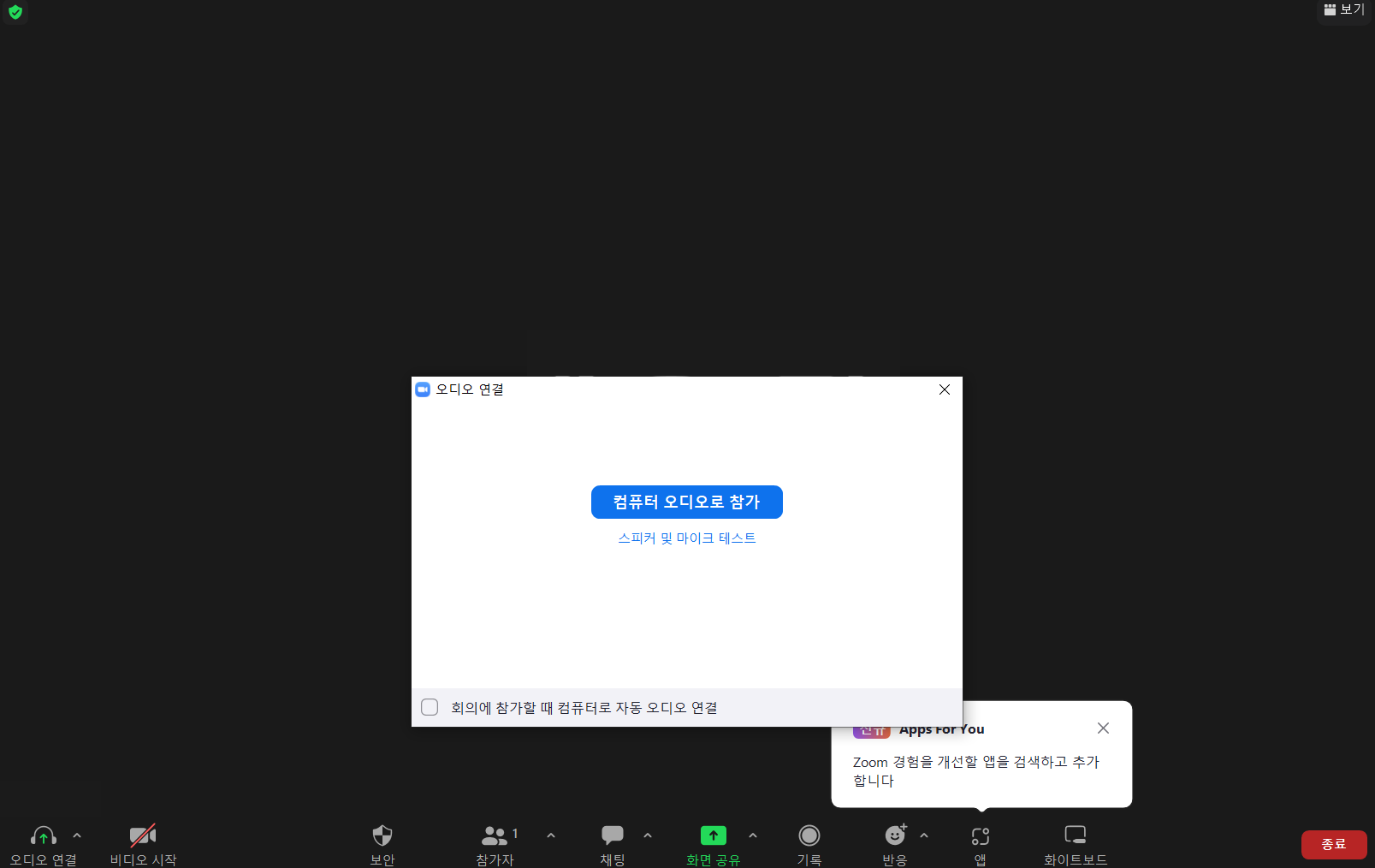 회의방 처음 개설시 나오는 화면 입니다. 먼저 (오디오 연결)에 관한 설정 입니다. 보통 노트북 사용자라면 컴퓨터 오디오로 참가하시면 되고, 데스크탑의 경우 따로 마이크를 연결해주시거나, 웹캠 내에 장착되어있는 마이크를 사용하시면 되겠습니다.