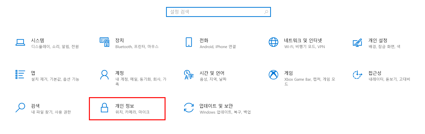여러가지 설정 관련 항목들이 보이는데요, 여기서 하단부에 보이는 (개인정보) 항목으로 이동합니다.