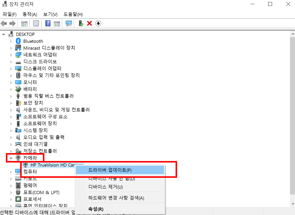 현재 PC(노트북)에 탑재되어 있는 장치들에 관한 설정을 할 수 있습니다. 중간 즘에 보시면 (카메라) 항목이 있을 텐데요, (만약 카메라 항목이 없다면 해당 장치가 제대로 설치되어 있지 않거나 인식이 되지 않고 있는 상태이니, 재설치 해보시거나 USB로 연결되어 있다면 다른 포트에 연결해보시는 것도 방법입니다). 카메라를 선택하면 현재 장착되어있는 제품명이 보이실 텐데요 마우스 오른쪽을 누르면 드라이버 업데이트가 보입니다. 드라이버를 최신버전으로 업데이트 하신 뒤 줌에서 재접속 해보시면 되겠습니다.