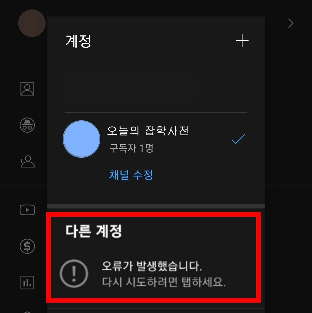 이처럼 현재 사용중인 계정이 아닌, 나의 다른 계정으로 전환하고 싶을때, (오류가 발생했습니다), 다시 시도하라는 메시지와 함께 전환이 불가한 경우가 종종 발생합니다. 이럴때는 로그아웃 하고 다시해봐도 똑같은 현상이 반복되는데요,