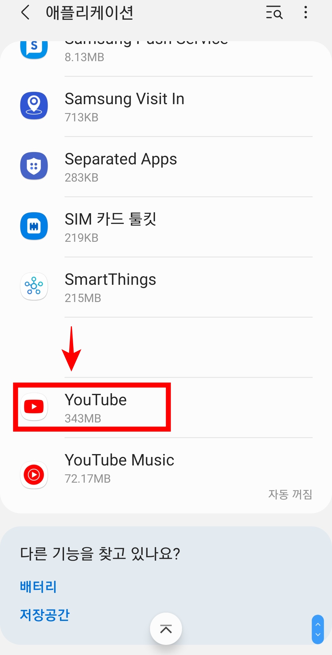 현재 사용중인 어플 목록이 길게 뜨는데요, 여기서 youtube를 찾아서 들어갑니다.