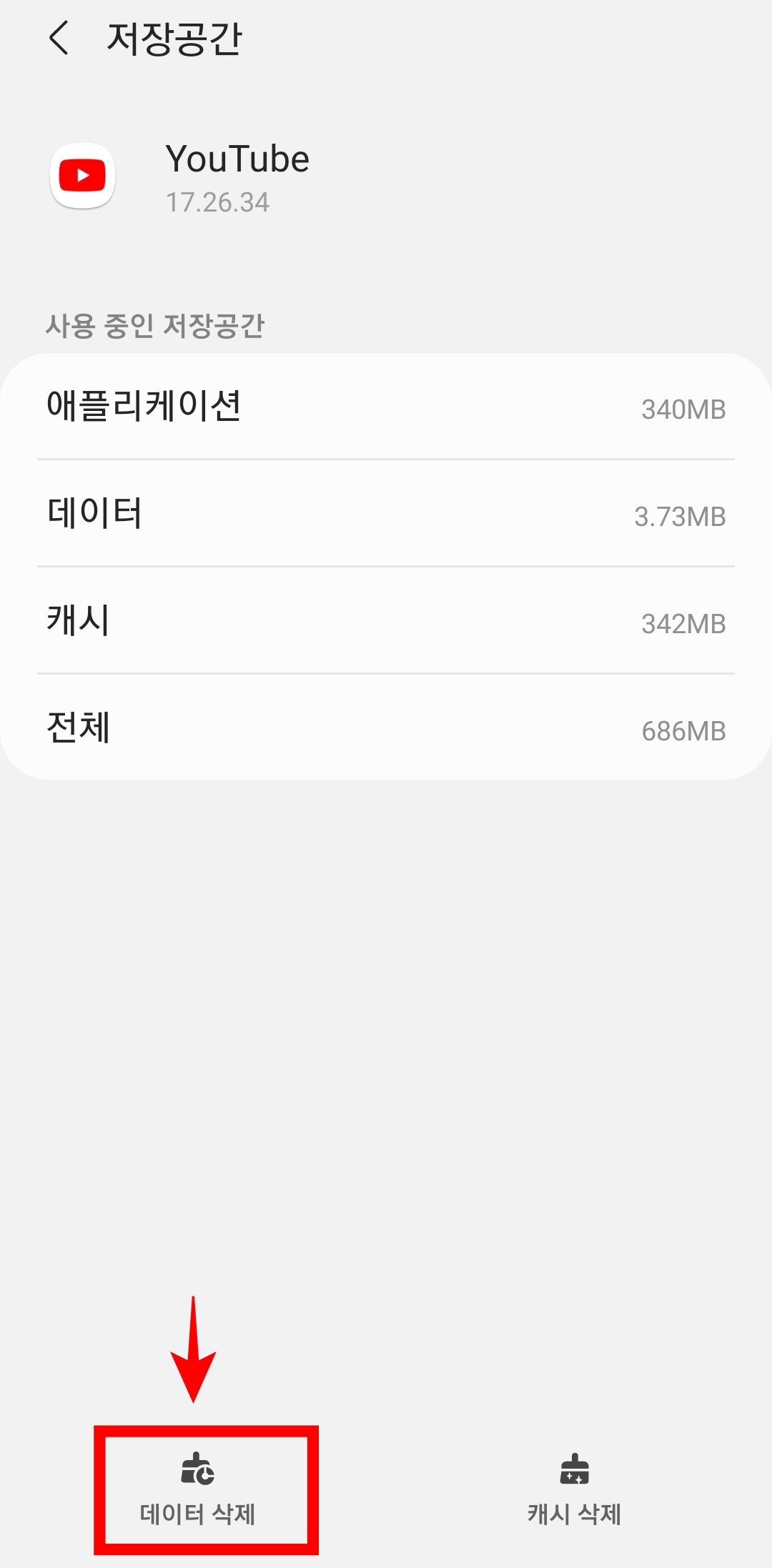 애플리케이션 정보에 들어오셨다면 (저장공간)항목을 봅시다. 저의경우 686MB나 되는 용량을 차지하고 있네요, 저장공간으로 진입해주면 현재 사용중인 용량의 세부적인 목록이 나오는데요, 여기서 아래에보이는 (데이터 삭제)를 진행해 줍니다 앱이나 계정이 지워지는 것은 절대 아니고, 내가 그동안 유튜브를 보면서 설정해 놓았던 재생 방식이나 테마, 시청 기록 등은 초기화 될 수 있습니다. 크게 문제될 부분은 없으므로 계정 전환이 불가능해서 답답하신 경우에 진행해 보시면 해결되시리라 생각합니다.