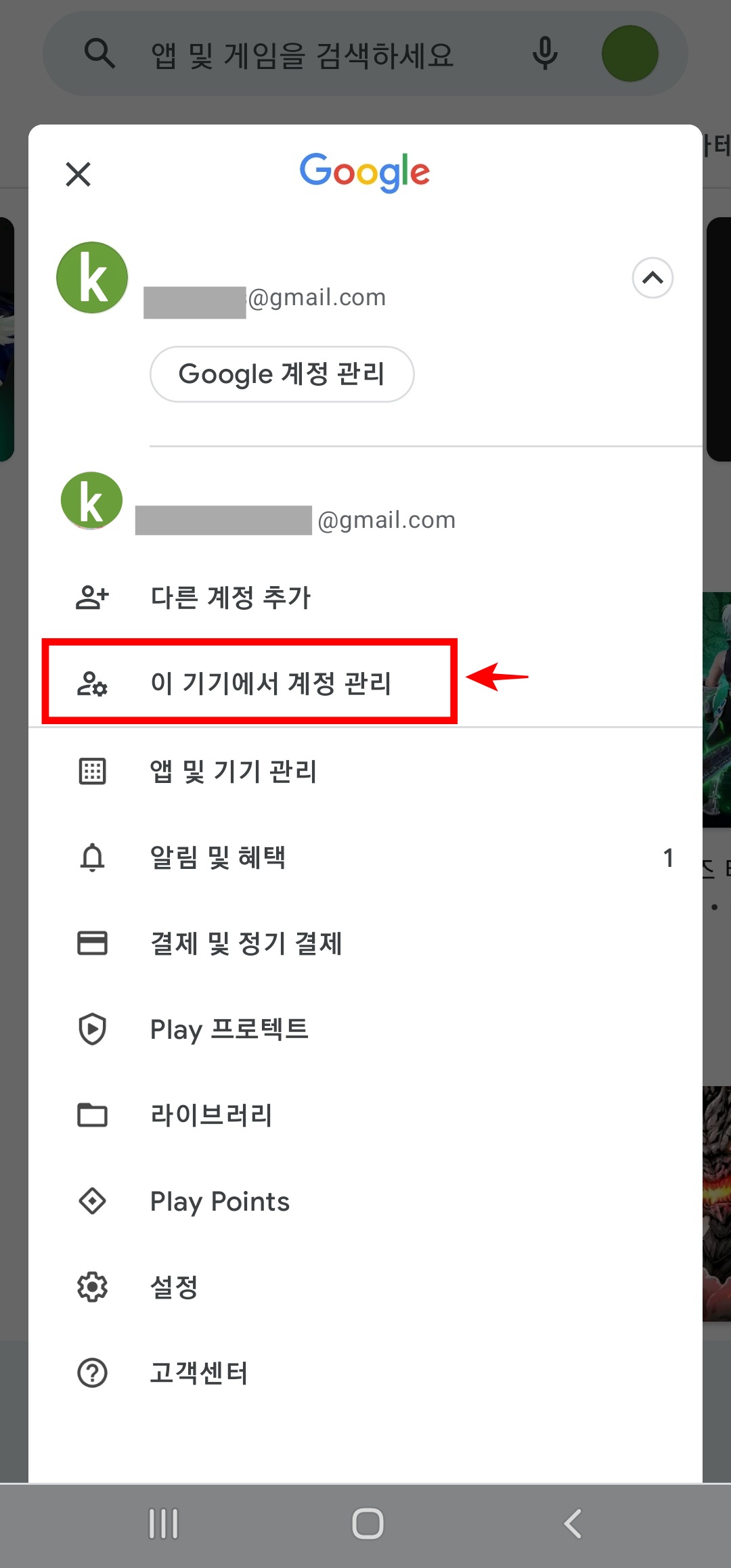 현재 사용중인 핸드폰에서 앱에 등록되어있는 계정들 목록이 나옵니다. 여기서 아까 기억해놓은 구글 플레이 계정을 선택하여 눌러줍니다.