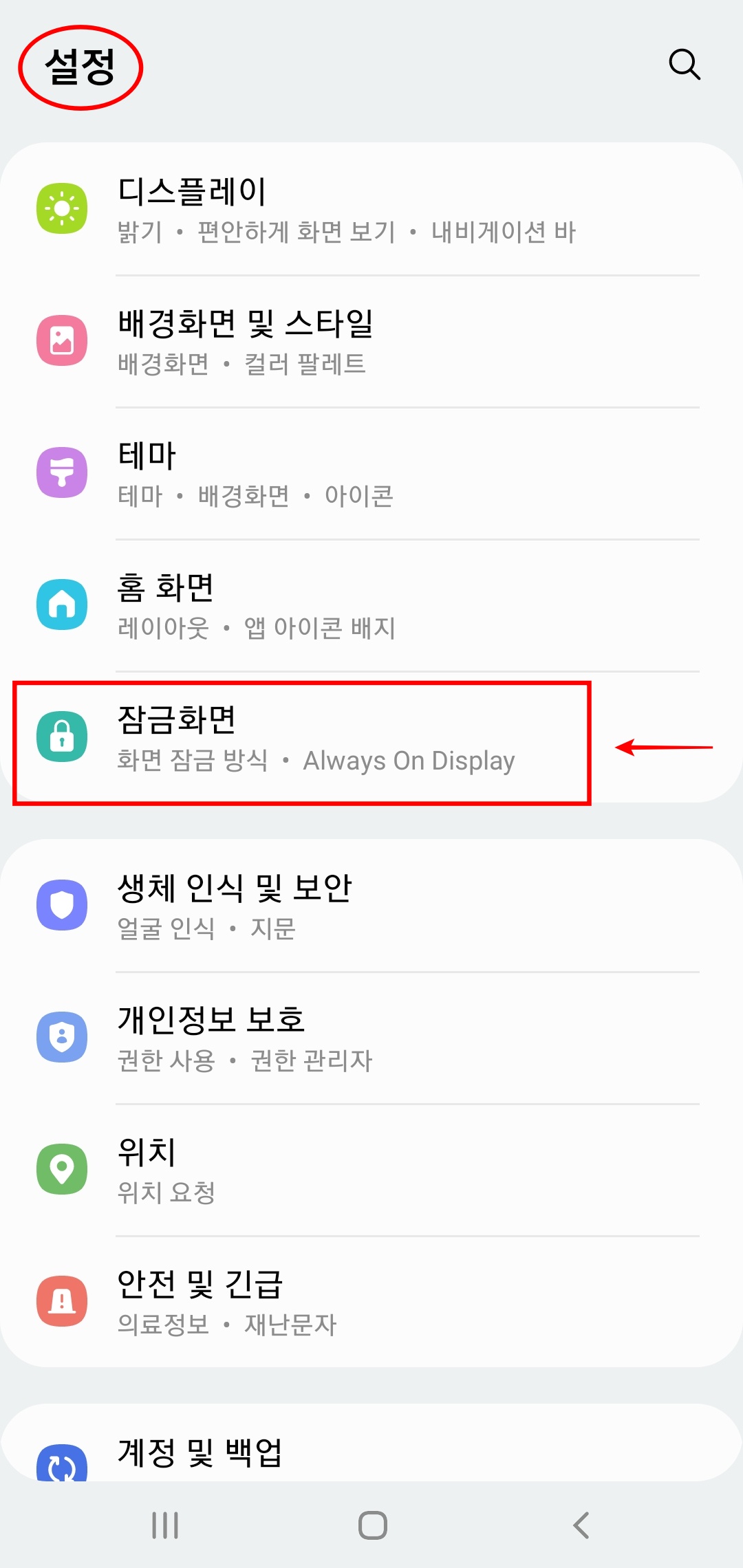 이곳에서 화면 잠금 방식을 조정 할 수 있는 (잠금화면) 메뉴로 가봅시다.