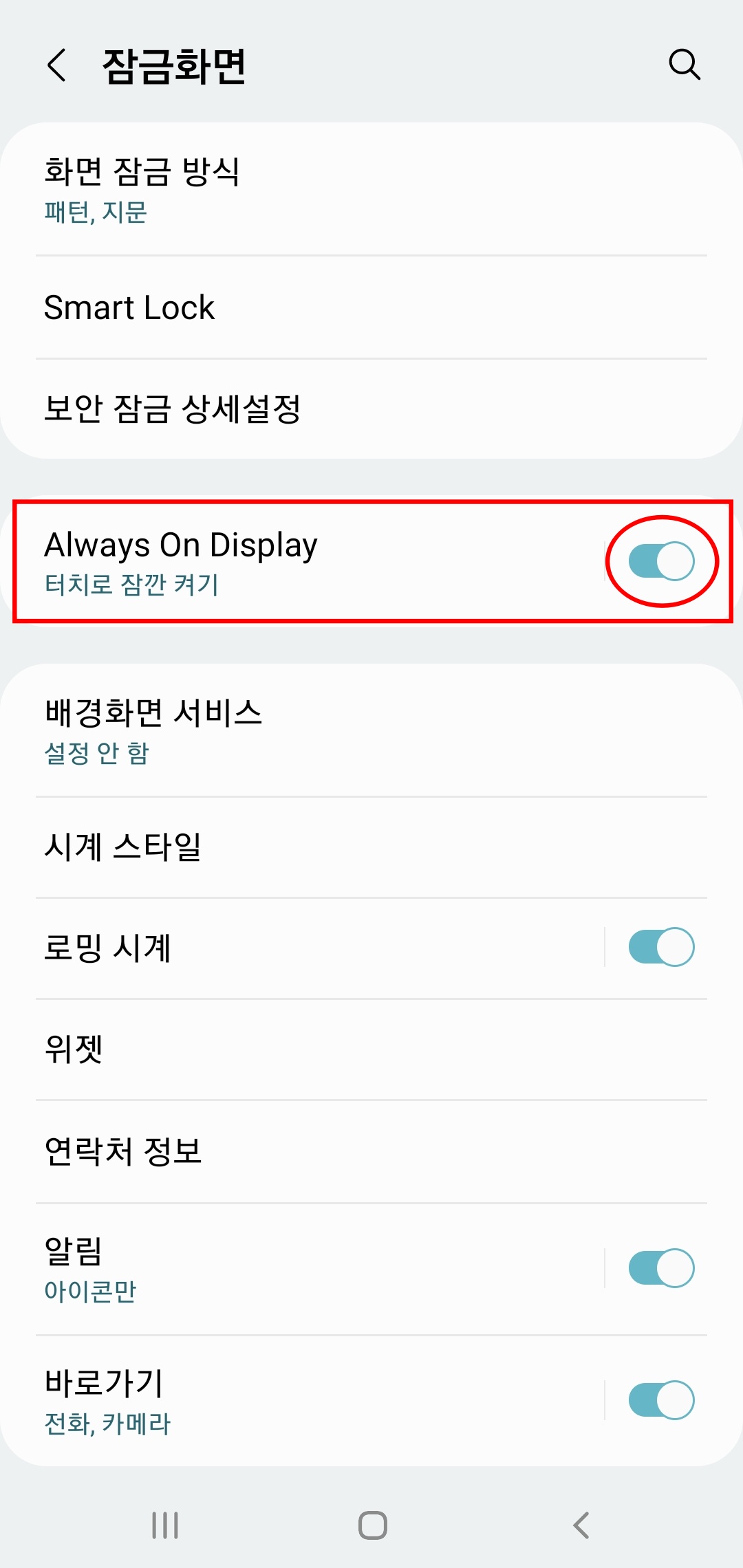 얼웨이즈 온 디스플레이의 상태를 (사용중) 으로 바꾸어 주신 뒤, (꺼진 화면 위에 시간과 알림을 보여줍니다)에서 (항상 켜기)를 선택해 주면 완료됩니다. 보통은 기본설정이 (터치로 잠깐 켜기로 되어있습니다)