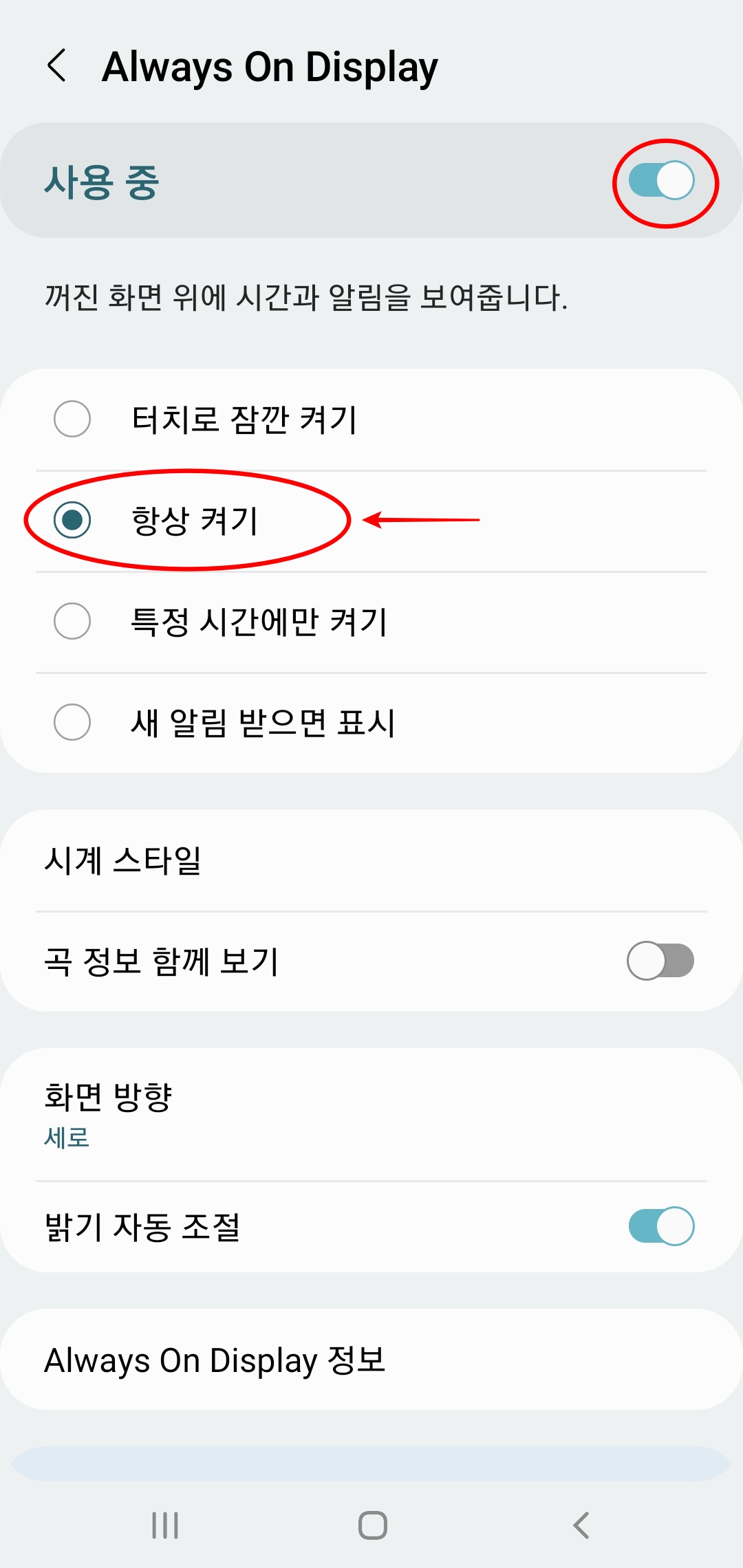 얼웨이즈 온 디스플레이의 상태를 (사용중) 으로 바꾸어 주신 뒤, (꺼진 화면 위에 시간과 알림을 보여줍니다)에서 (항상 켜기)를 선택해 주면 완료됩니다. 보통은 기본설정이 (터치로 잠깐 켜기로 되어있습니다)