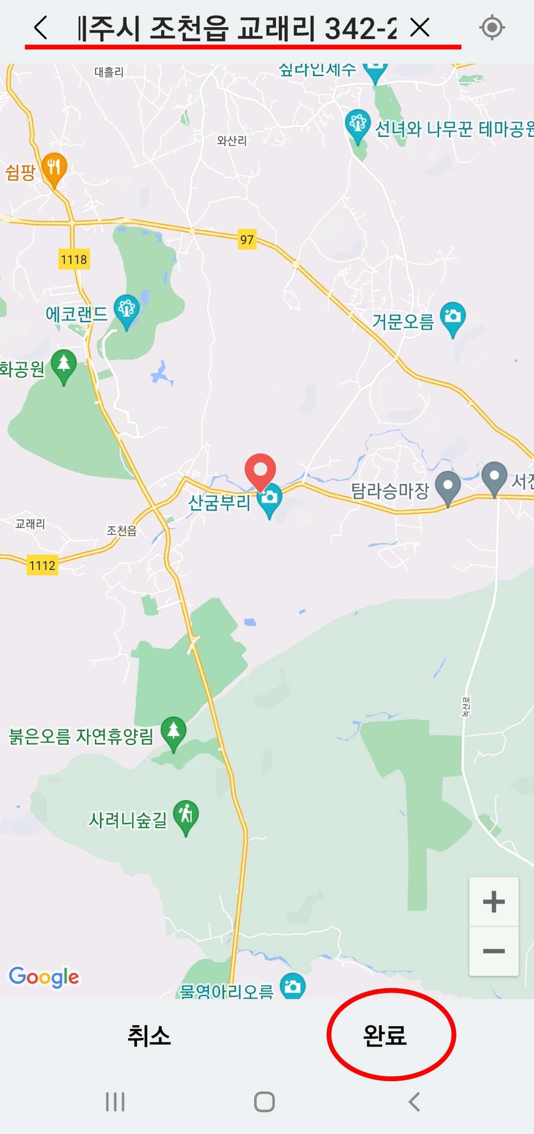 여기서는 구체적인 장소의 주소를 직접 입력해 주어야 하는데요, 입력이 다되었으면 (완료)를 누릅니다.