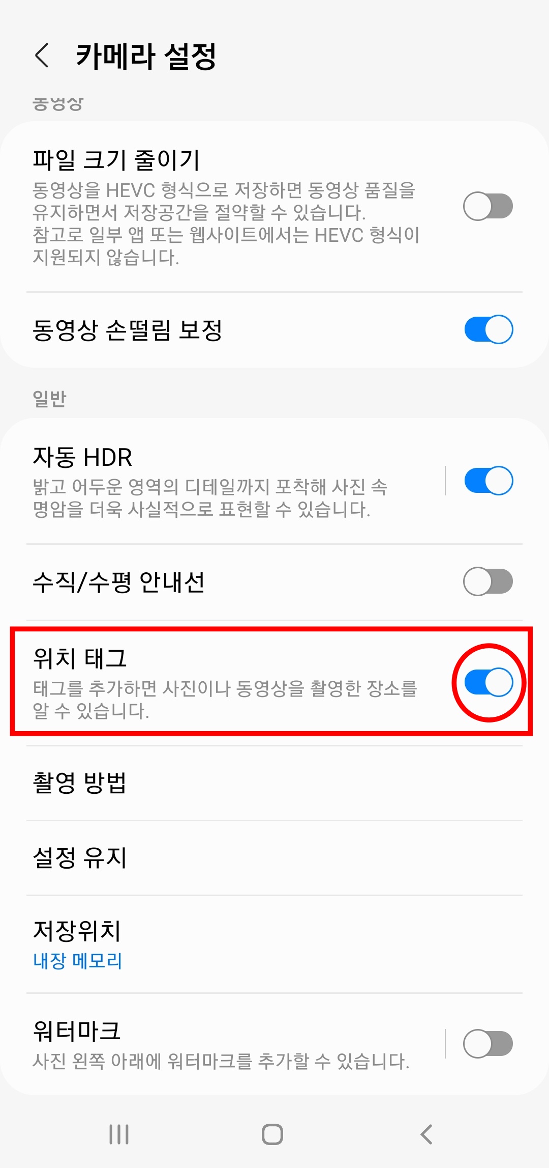 설정에 여러 항목들이 보이는데요, 여기서 (위치 태그) 버튼을 활성화 시켜 줍니다. 이제 앞으로 카메라 촬영을 하게되면 자동으로 위치를 불러와서 함께 저장됩니다.