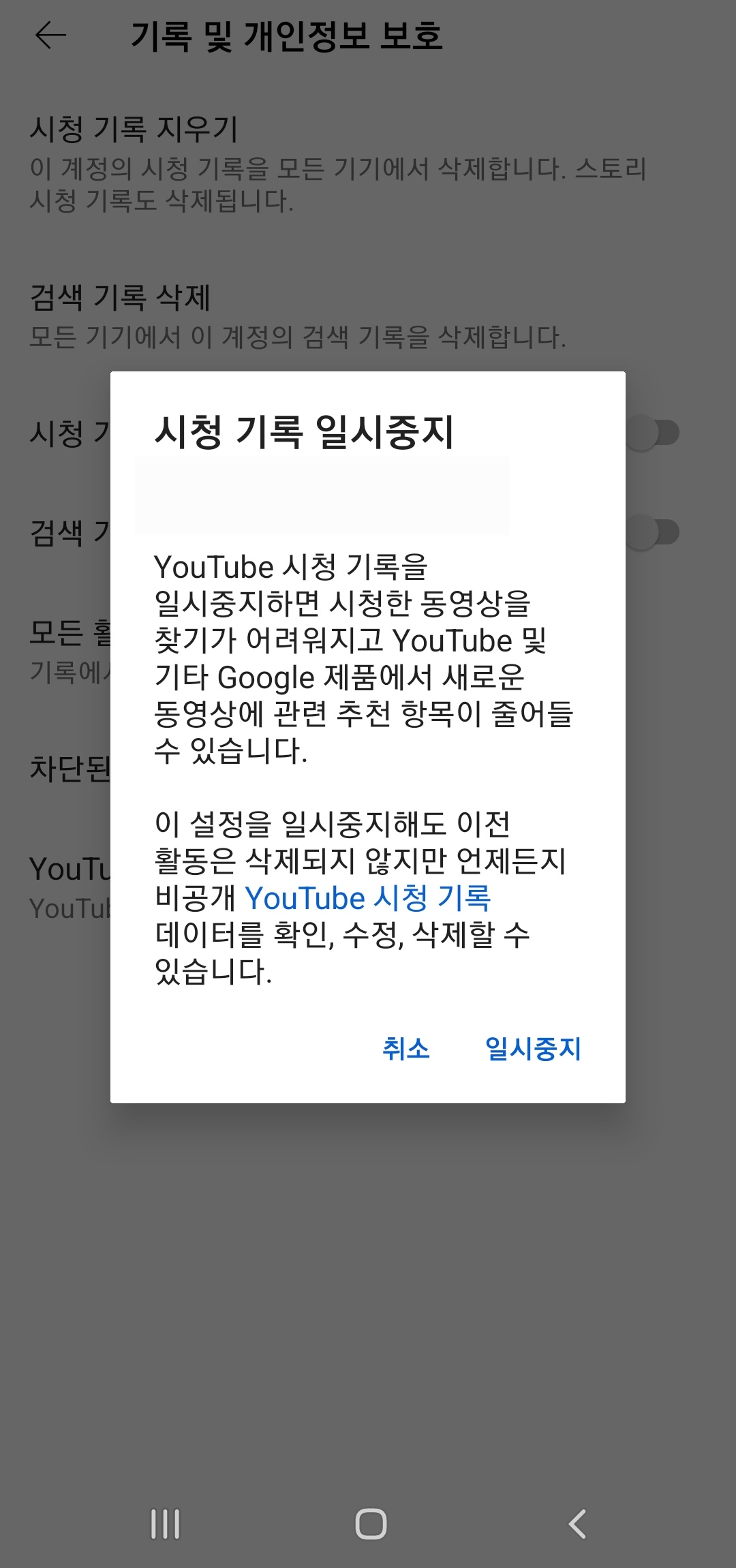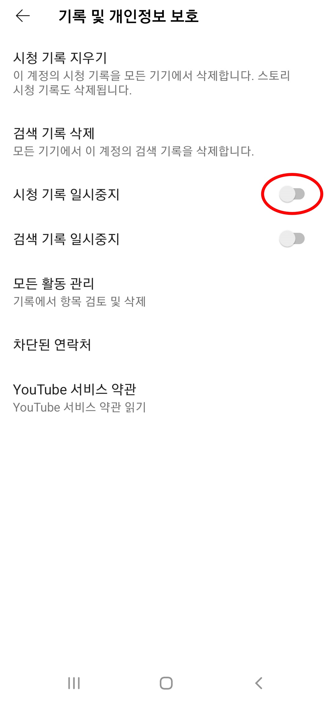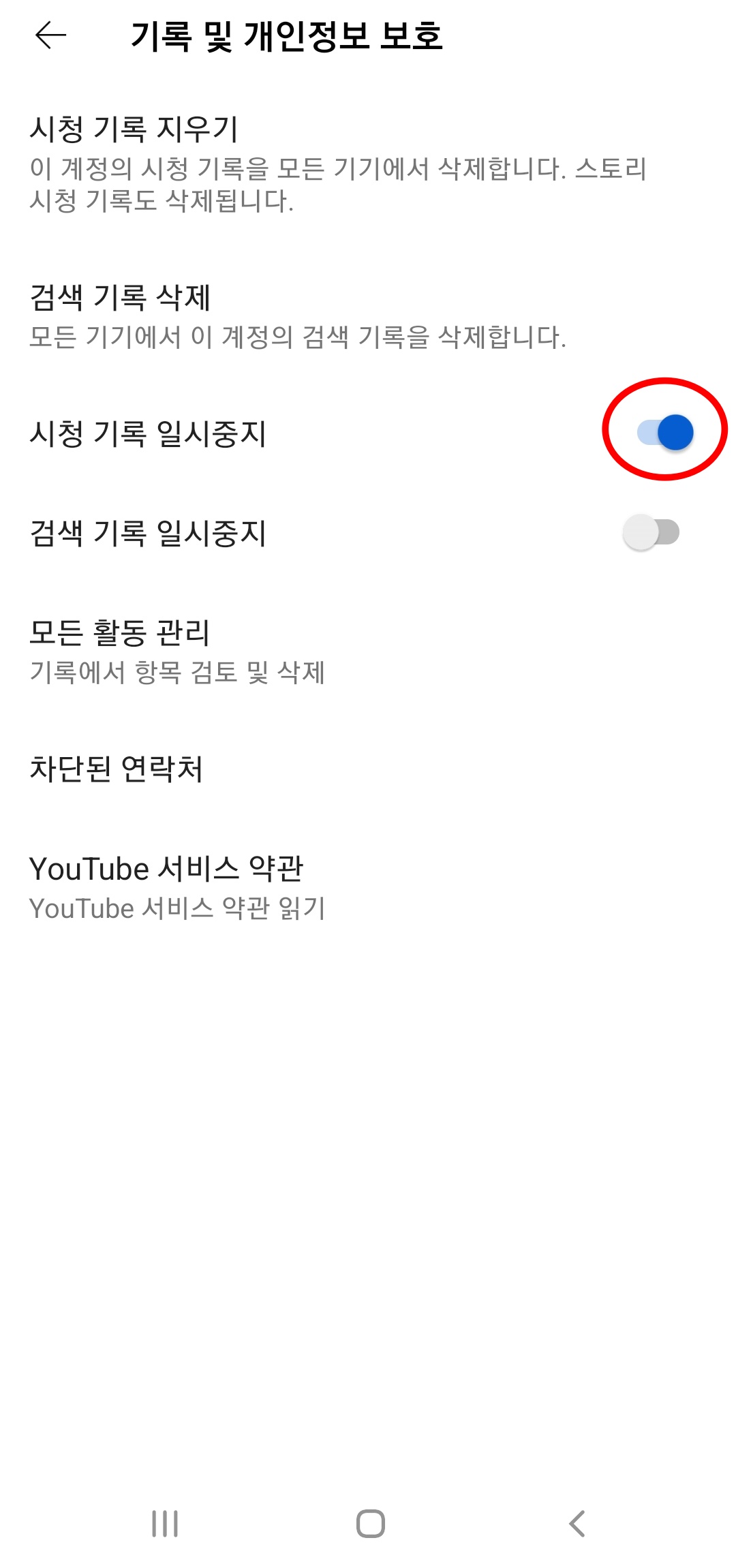 앞서 살펴봤던 (설정)에서 (기록 및 개인정보 보호) - (시청 기록 일시중지) 버튼을 파란색으로 바뀌도록 활성화 시켜주시면 됩니다.