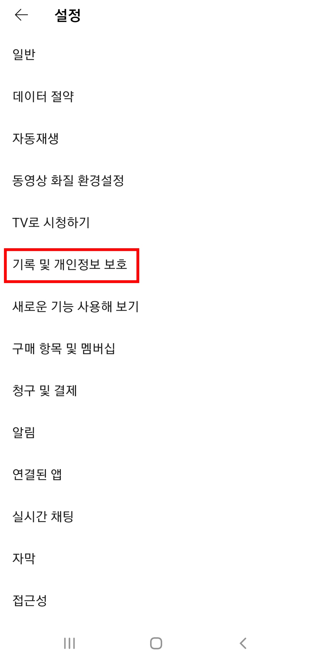 (기록 및 개인정보 보호) 항목이 있는데요, 여기서 사용자의 검색, 시청 기록을 관리합니다. 만약 이전에 검색했던 내용들을 삭제하거나 하고싶다면 여기서 해주시면 해결됩니다.